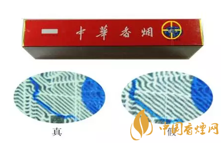 “中華”原產(chǎn)地標(biāo)志為藍(lán)色橢圓形,折光可見(jiàn)“中華”字樣、8顆“★”及天安門(mén)圖案。真煙色彩飽滿,圖案清晰;假煙色彩暗淡,圖案模糊。同時(shí)還可以借助圖中藍(lán)色線的走勢(shì)來(lái)區(qū)分真假煙。