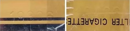 真品卷煙鋼印打印的數(shù)字感覺(jué)較為粗糙,有力度感且排列不整齊。該款假冒卷煙鋼印打印比較輕,無(wú)力度感且排列整齊。(左真右假)