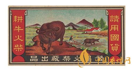 上世紀(jì)30年代,啟昌火柴廠出品的“耕牛”(圖1)火花,就描繪了一幅美麗的山村春耕圖:在數(shù)棵綠油油的樹木點綴下,幾戶農(nóng)家散落分布于山腳前的農(nóng)田里,一位頭戴斗笠的農(nóng)夫正扶犁驅(qū)牛耕田,近處則是一頭碩大的水牛目視前方的形象。