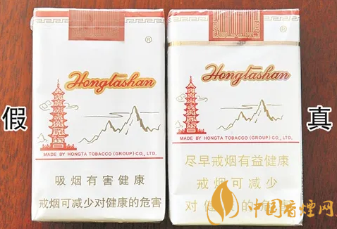 假煙采用膠印印刷,兩種顏色交界邊緣無鋸齒痕跡,“1956”字體筆畫粗細(xì)不均勻、無立體感且相對較細(xì),紅塔圖案模糊。