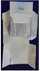 小盒透明紙材質、包裝方式同條盒,拉帶頭為半橢圓形,位于正面左側,順時針拉開。商標紙為白卡紙,膠粘劑類型為白乳膠,兩側點陣膠。