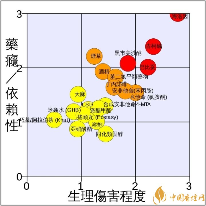 結尾分享一下剛看到的研究發(fā)現(xiàn)。20位從事依賴性治療的精神病醫(yī)師,在二十種常見管制藥品比較其傷害性(橫軸)及成癮性(縱軸),于2007年發(fā)表在權威醫(yī)學期刊《柳葉刀》,顯示煙草在成癮性排名第三,潛在危害程度排名第七,可見煙草的依賴性和傷害可能比某些傳統(tǒng)毒品還大。
