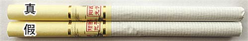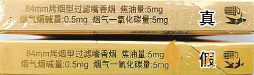 2.背面商標(biāo)紙印刷工藝差異對(duì)比:真煙背面中間“花球”圖案采用壓凸?fàn)C金工藝,用手摸凹凸感明顯,且“花球”線條清晰;假煙采用高清掃描仿制印刷,中間“花球”圖案用手摸無(wú)凹凸感,且“花球”線條模糊、部分區(qū)域有粘連重疊。