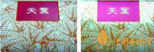 真品天葉卷煙此處圖案,煙葉根莖、葉脈圖案顏色正常且清晰,尤其是煙葉尖端脈絡清晰可見;而假煙此處圖案,根莖、葉脈有重疊、模糊不清現(xiàn)象。