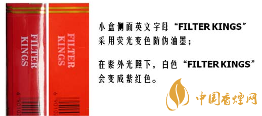 2.小盒:光變防偽涂層——小包側(cè)面“FILTER KINGS”字樣,經(jīng)陽(yáng)光直射或紫外光照射后由白色變成紫紅色,停止照射后,紫紅色會(huì)逐漸消退。