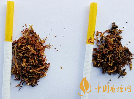 煙支及煙絲差異對比:真煙煙支黃色接裝紙長度為30mm,煙絲切絲寬度均勻,煙絲疏松、光澤油潤性好,呈檸檬黃色,煙絲結構為葉絲和少量造紙法再造煙葉;假煙煙支黃色接裝紙較長為32mm,煙絲切絲寬度不勻,光澤油潤性較差,煙絲結構為葉絲和膨脹梗絲,與真品特征存在明顯差異。