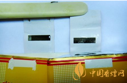 二、小盒頂部封簽?zāi)z水痕跡差異比對(duì):真品小盒封簽均為機(jī)器上膠,上膠均勻且有規(guī)則;假煙多為手工涂膠痕跡,上膠無規(guī)則,與真品卷煙工藝比對(duì)存在明顯差異。
