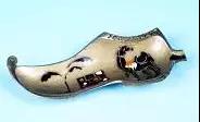 這款造型奇特的工藝煙灰缸來自以色列,為金屬質(zhì)地,外層漆金。整體造型為以色列特有的翹頭鞋,鞋跟處伸出一截短短的煙槽,鞋口則有陰刻的“JERUSALEM”(耶路撒冷)字樣;鞋身用簡單的黑、紅、黃、白勾勒了具有明顯地域色彩的花紋,如回首的駱駝、椰樹、城墻等。整件作品的造型和色彩都帶有濃郁的中東風(fēng)情,高檔煙灰缸圖片十分別致。